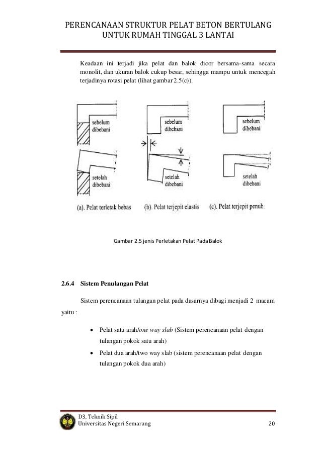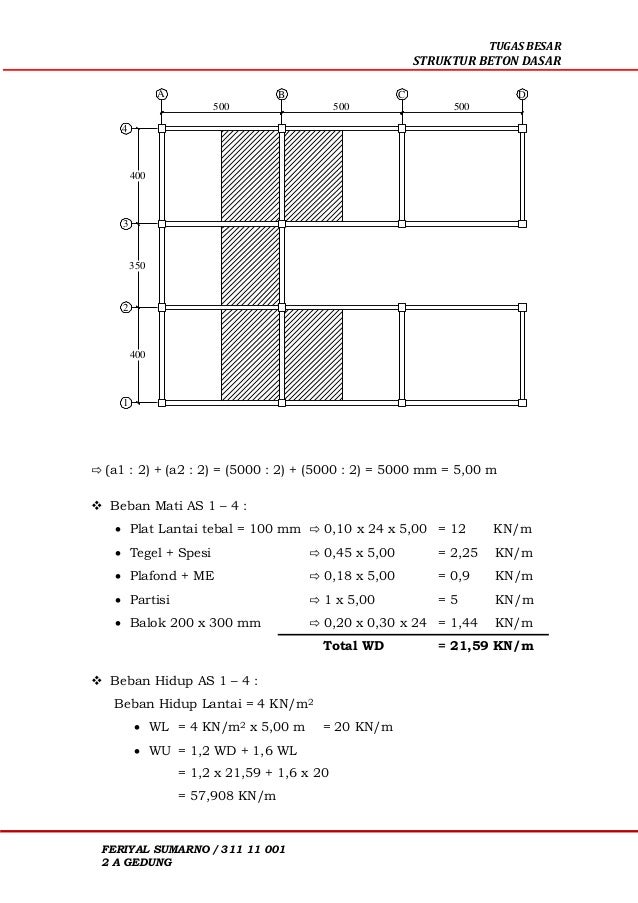 Plat lantai beton tebal 15cm, memakai besi tulangan d12 jarak 20 cm dua lapis atas bawah. Balok mendukung beben kerja yang terdiri dari beban hidup merata 52 kn/m dan beban mati merata 32 kn/m. Struktur plat rumah 2 lantai. Bab i pembebanan struktur 1.1 kodefikasi balok gambar 1.1 kodefikasi balok 1 f1.2 estimasi ukuran balok syarat : Balok induk balok induk, adalah semua balok yang melintang tanpa topang pada seluruh lebar bangunan dan pada kedua ujungnya bertumpu pada kolom.